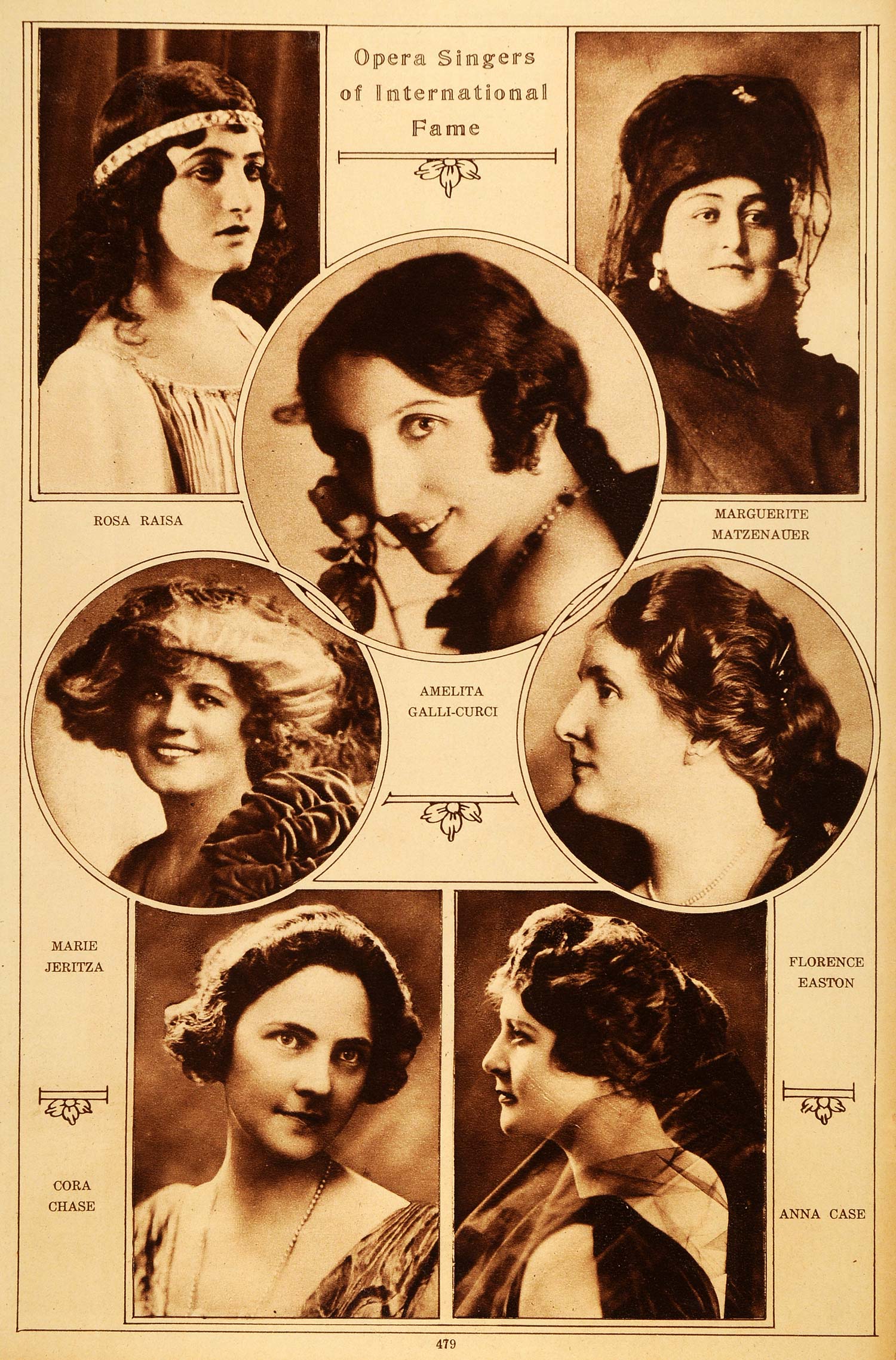 This is an original 1922 sepia rotogravure of famous opera singers. Shown are portraits of Rosa Raisa, Amelita Galli-Curci, Marguerite Matzenauer, Florence Easton, Anna Case, Marie Jeritza and Cora Chase. Marie Jeritza is known for her work with the Vienna State Opera and the Metropolitan Opera, and debuted as Olomouc in Wagner's