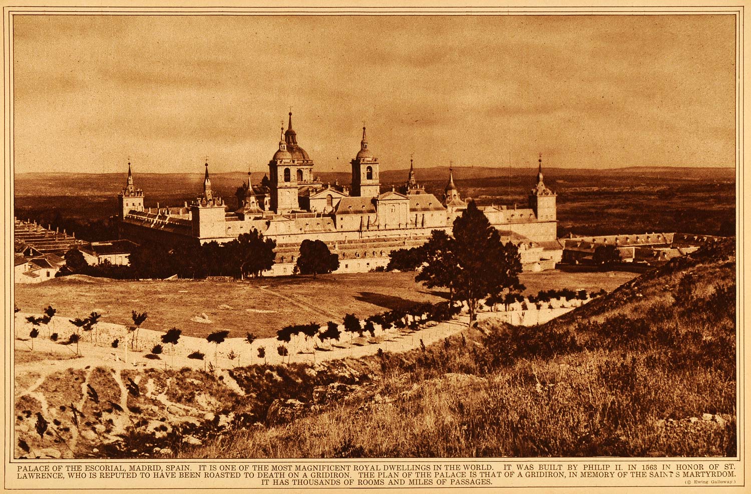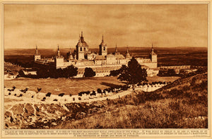 This is an original 1922 sepia rotogravure of the Royal Site of San Lorenzo de El Escorial in Madrid, Spain (España). The caption writes, "It was built by Philip II in 1563 in honor of St. Lawrence, who is reputed to have been roasted to death on a gridiron. The plan of the palace is that of a gridiron, in memory of the saint's martyrdom. It has thousands of rooms and miles of passages."