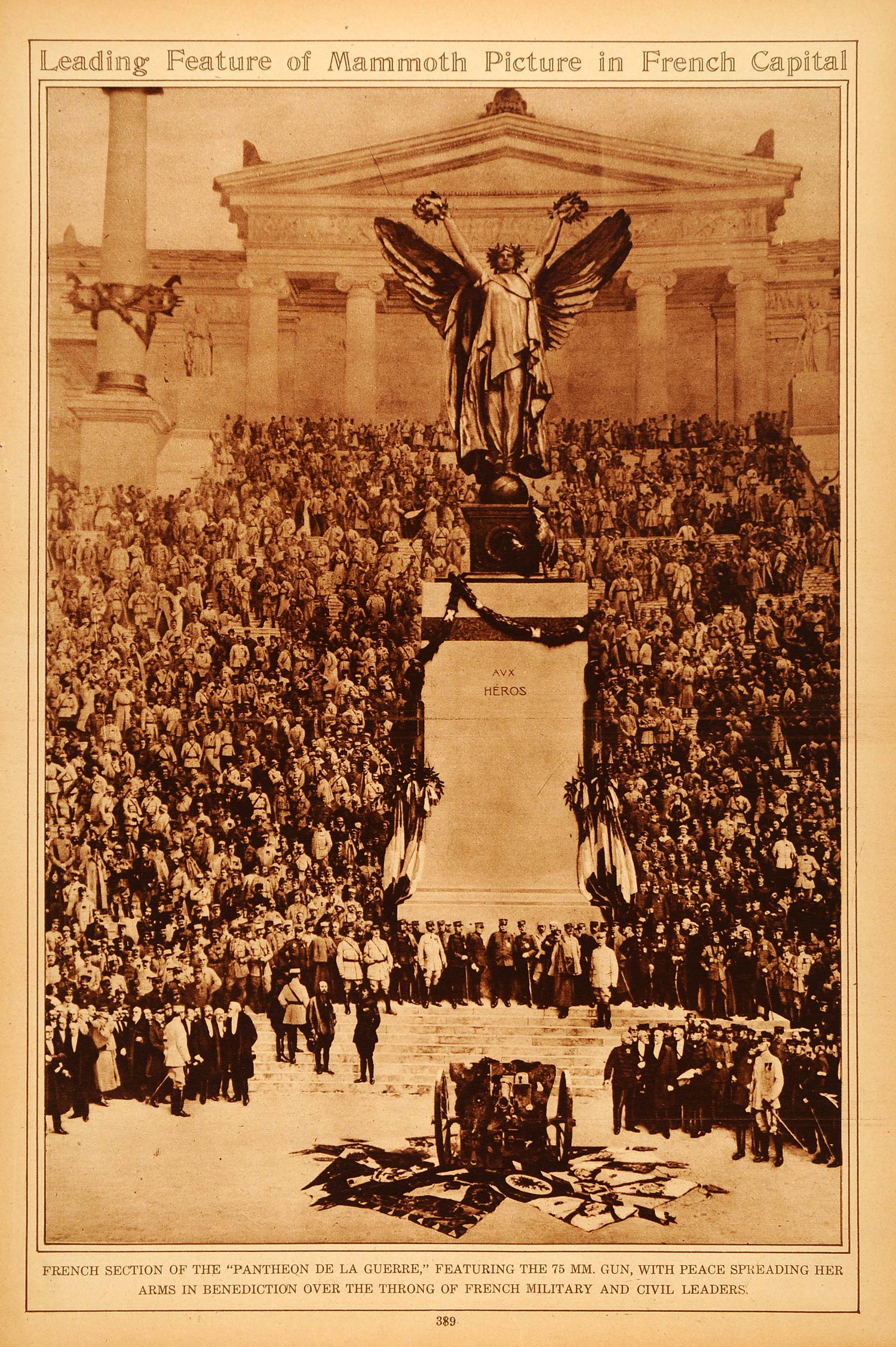 This is an original 1922 sepia rotogravure of a statue of Peace spreading her wings over French military and civil leaders. A 75 mm. gun rests in the foreground.