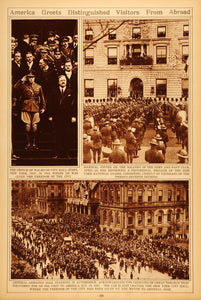 This is an original 1922 sepia rotogravure of famous figures visiting the United States. Shown in the top left image is the Prince of Wales on New York City's city hall steps. The top image on the right is Marshal Joffre on the balcony of the Army and Navy Club, and on the bottom is General Armando Diaz greeting the civilians in New York City. The caption for Marshal Joffre writes, "Marshall Joffre on the balcony of the Army and Navy Club, April 26, 1922, reviewing a provisional brigade of the New York National Guard, consisting chiefly of veterans of the 27th Division."