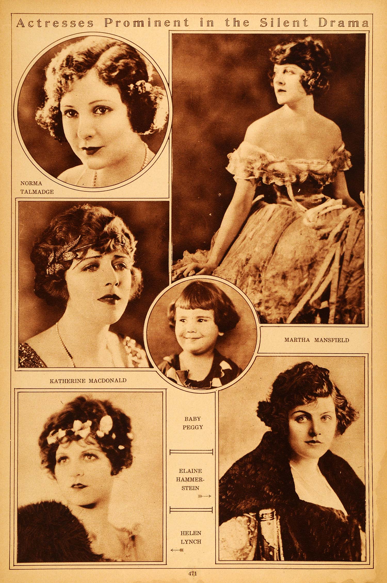 This is an original 1922 sepia rotogravure of various famous silent film actresses. Portraits shown include Norma Talmadge, Martha Mansfield, Katherine MacDonald, Baby Peggy (Diana Cary), Elaine Hammerstein, and Helen Lynch.