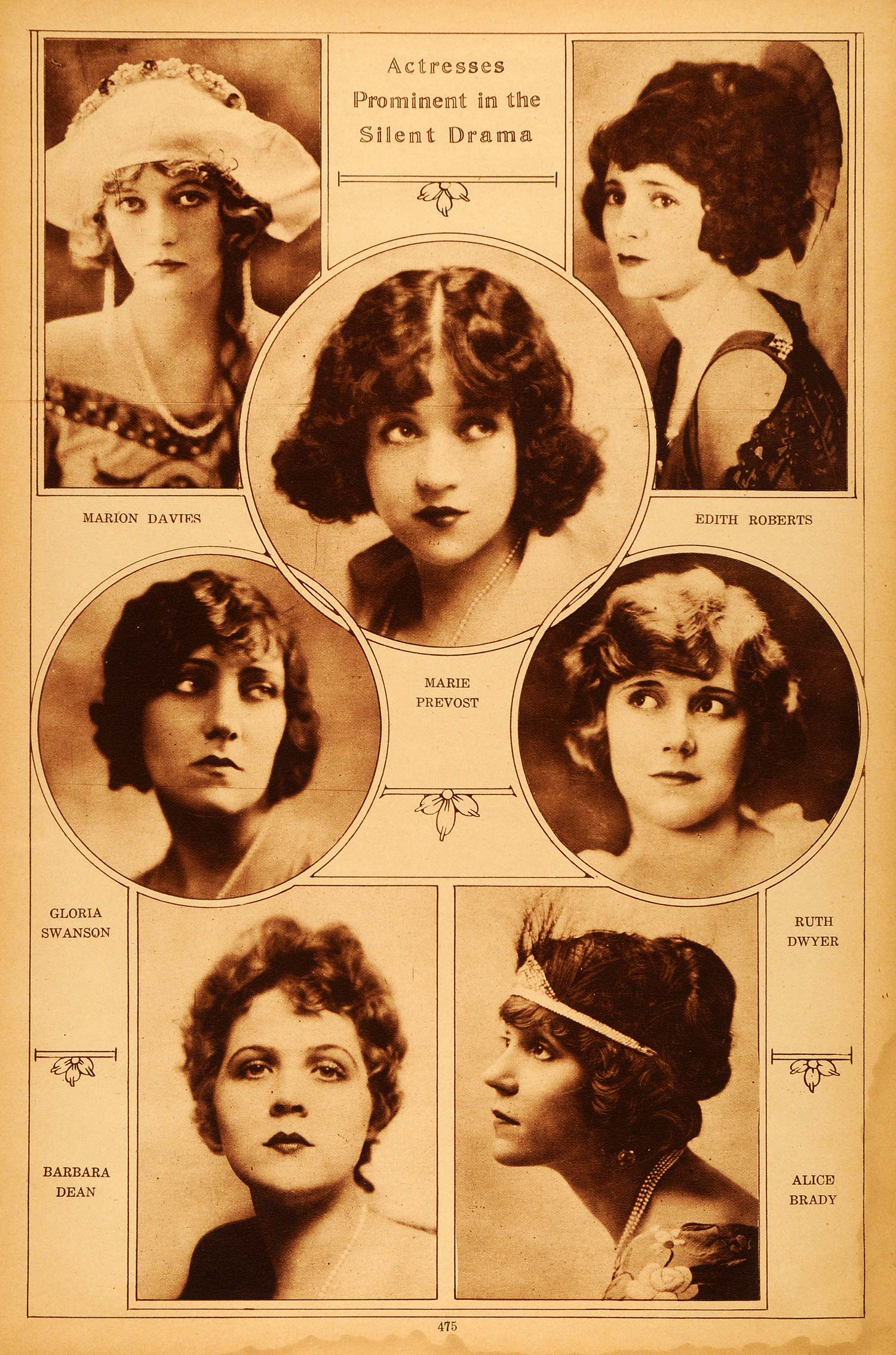 This is an original 1922 sepia rotogravure of famous silent film actresses. Shown are portraits of Marion Davies, Marie Prevost, Edith Roberts, Ruth Dwyer, Alice Brady, Gloria Swanson, and Barbara Dean. Gloria Swanson appeared in Sunset Boulevard and Queen Kelly, and is noted for having a famous affair with Joseph P. Kennedy-- father of John F. Kennedy.