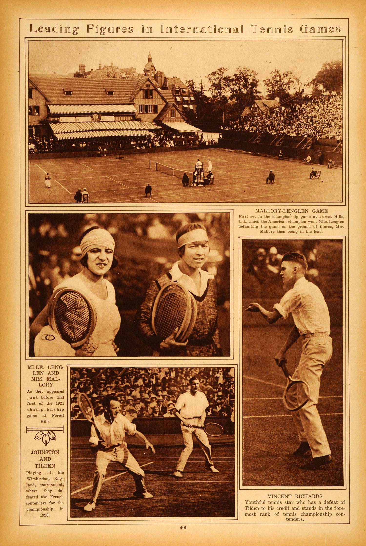 This is an original 1922 sepia rotogravure of famous figures of international tennis games. Shown are Mlle. Lenglen and Mrs. Mallory during their 1921 championship game. Also shown are Johnston and Tilden playing at the Wimbledon, England tournament and shown on the right is Vincent Richards.