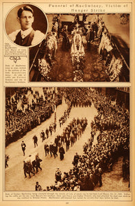 This is an original 1922 sepia rotogravure of the funeral procession of Terence MacSwiney, the Sinn Féin Lord Mayor of Cork, who starved himself to death in Brixton Prison after being arrested for having seditious documents. He was sentenced to two years at the prison, where he immediately began his hunger strike. He lived for 74 days before falling into a coma and dying. Seen in the top image is his body surrounded by Father Dominic, who tended to him in prison, and one of his brothers. In the bottom image, the coffin is followed by Father Dominic, and his two brothers, Sean and Peter.