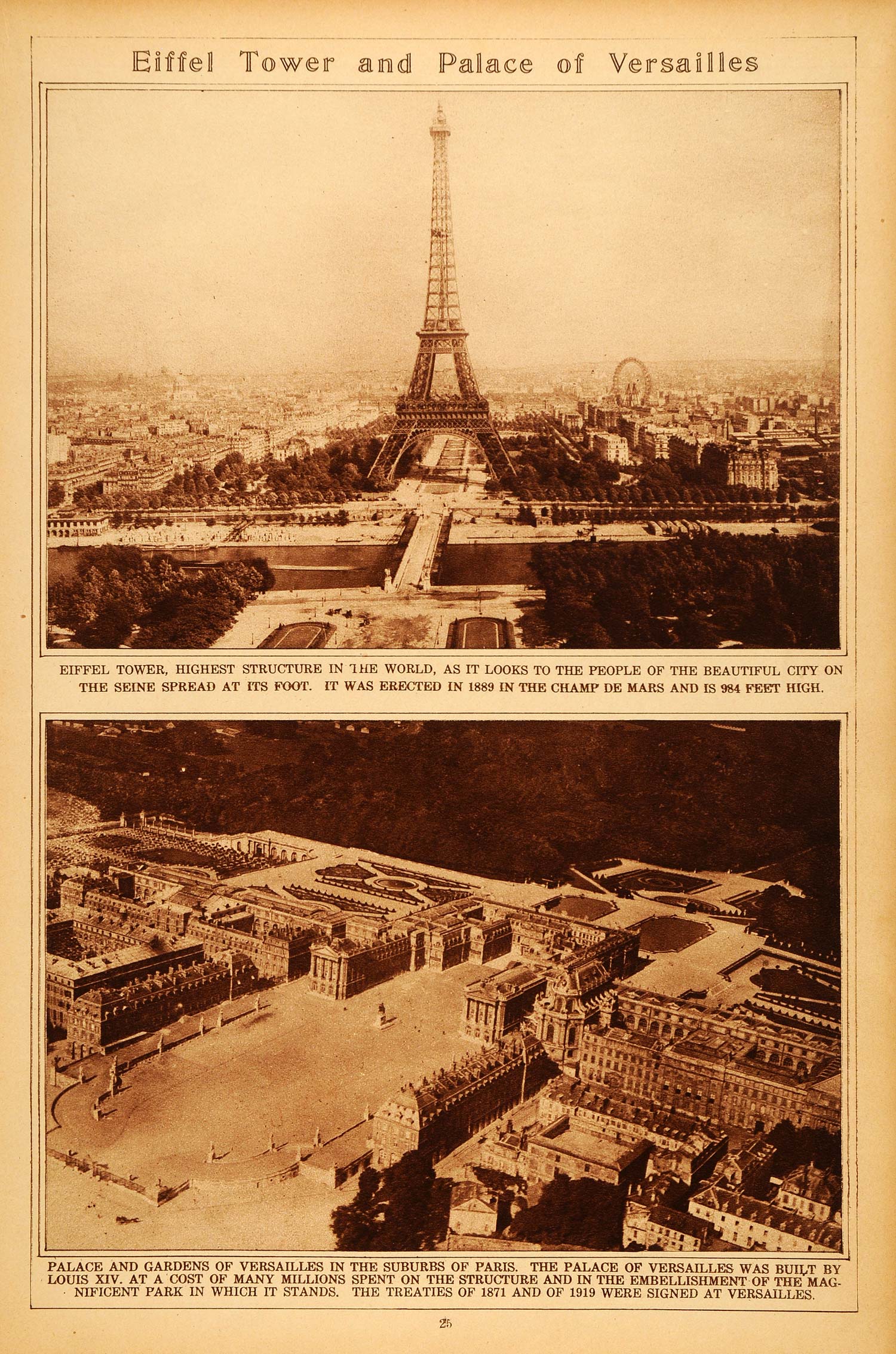 This is an original 1922 sepia rotogravure of the Eiffel Tower and the Palace of Versailles. The caption for the palace begins, "Palace and gardens of Versailles in the suburbs of Paris. The Palace of Versailles was built by Louis XIV. At a cost of many millions spent on the structure and in the embellishment of the magnificent park in which it stands." Louis XIV became an integral part of the expansion of the château, and developed the royal hunting lodge into one of the largest palaces in the world. As for the Eiffel Tower, it is the tallest building in Paris, and was constructed in 1889 for the World's Fair by engineer and designer Gustave Eiffel. Since the fair, it has become one of the most iconic monuments in the world, and is the distinguished symbol of Paris and France.