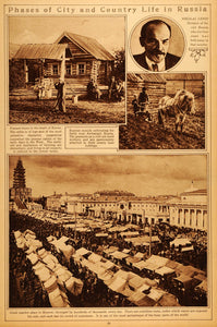 This is an original 1922 sepia rotogravure of a peasant home in Russia; Vladimir Lenin; a marketplace in Moscow; and a farmer near Archangel. The caption for the Russian farmer writes, "Russian moujik cultivating his fields near Archangel, Russia. The peasants as a rule are hard workers and are passionately attached to their scanty land holdings."