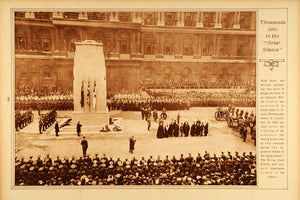 This is an original 1922 sepia rotogravure of the body of the British unknown soldier being carried to his burial place in Westminster Abbey in London, England two years after the signing of the armistice. The caption writes, "The throng is here seen at the cenotaph paying the impressive tribute of the 'great silence.' The King, royal Princes and eminent dignitaries joined in the tribute."