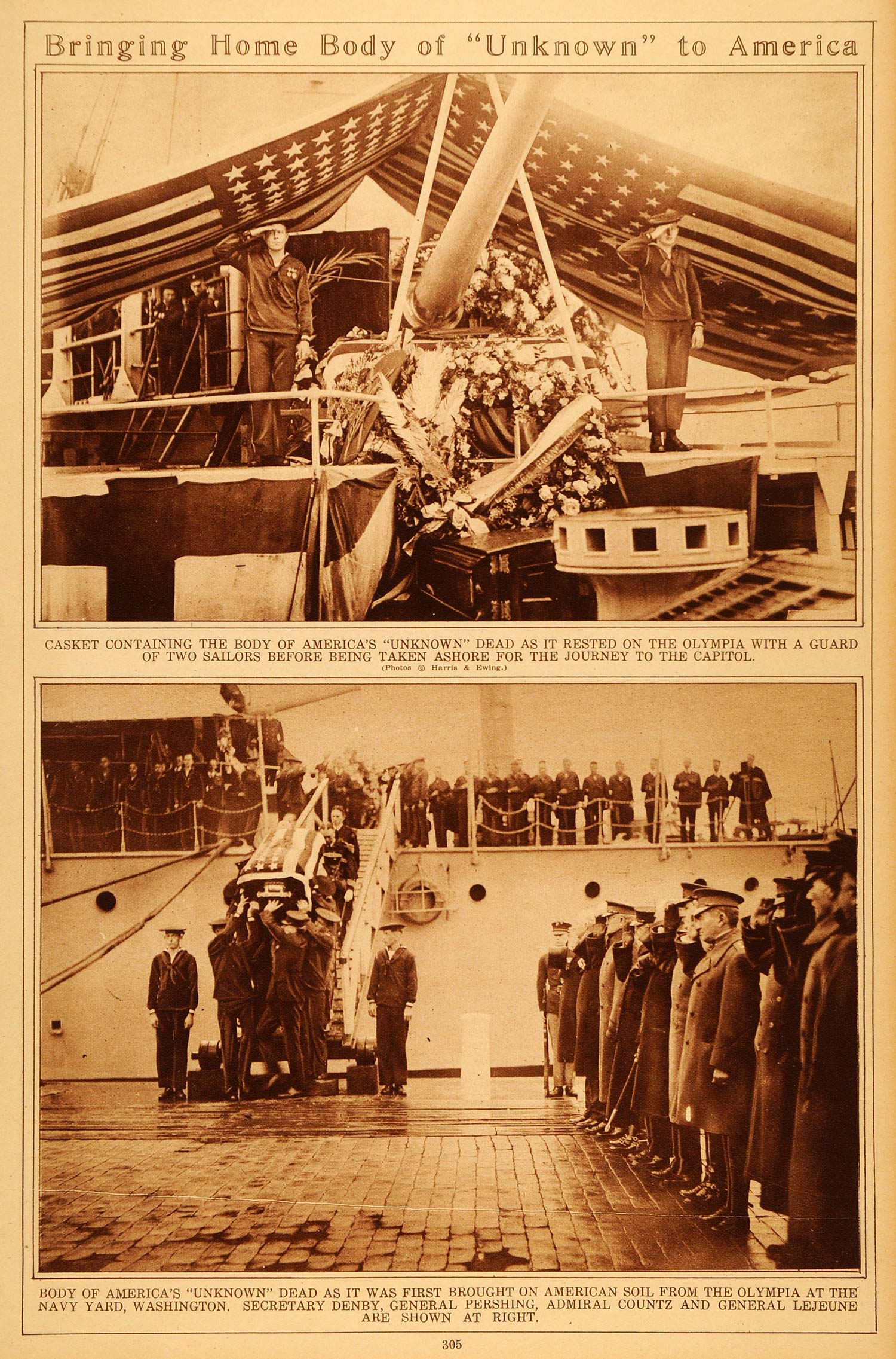Olympia. The caption writes, "Casket containing the body of America's 'unknown' dead as it rested on the Olympia with a guard of two sailors before being taken ashore for the journey to the capitol." The bottom shows the coffin being unloaded from the ship at the Navy Yard in Washington, D. C. Shown to the right is Secretary Denby, General Pershing, Admiral Countz and General LeJeune.