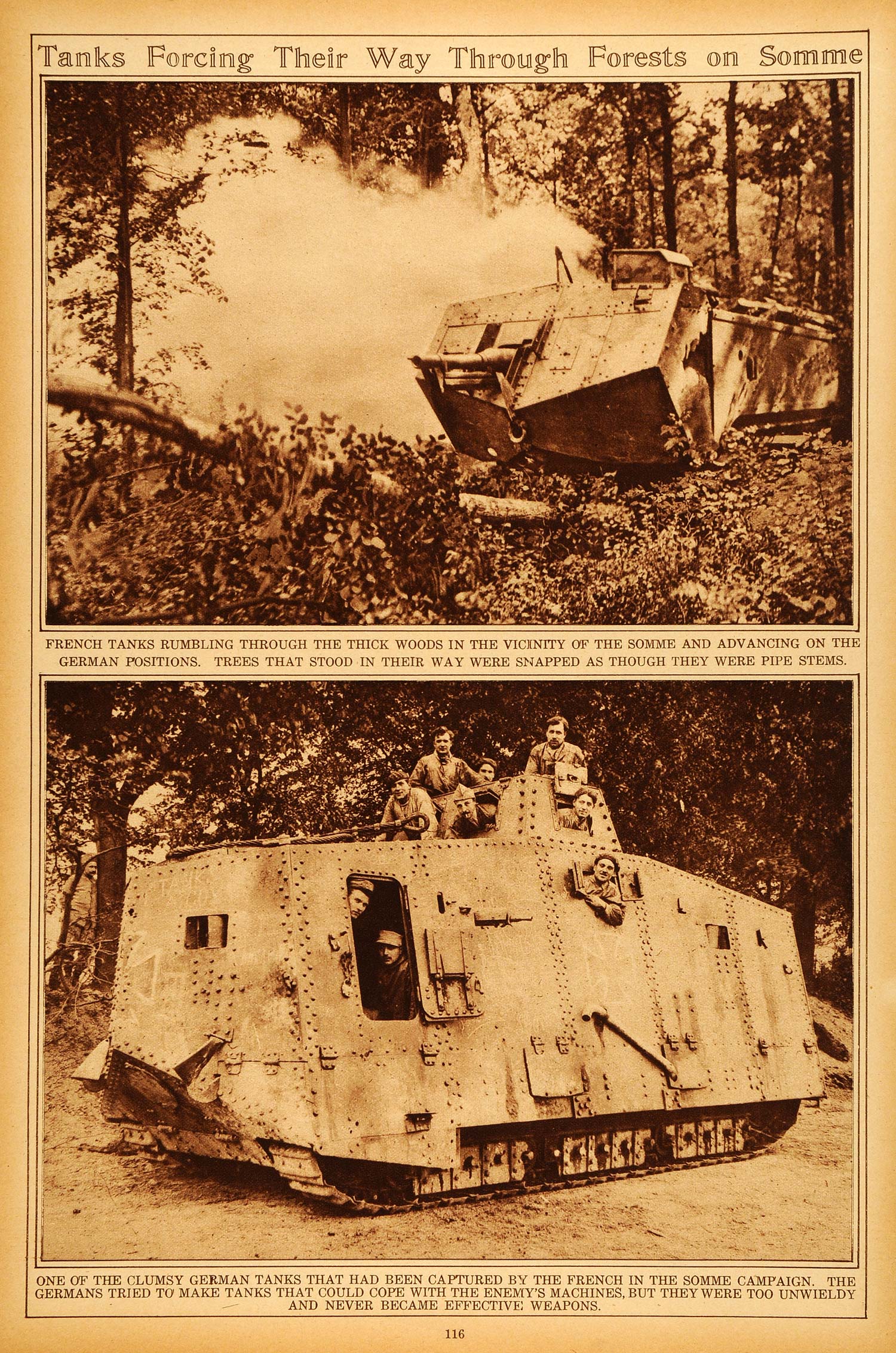 This is an original 1922 sepia rotogravure of a French tank pushing through the woods near the Somme, and the bottom image portrays a German tank that had been captured by the French. The caption for the latter writes, "One of the clumsy German tanks that had been captured by the French in the Somme campaign. The Germans tried to make tanks that could cope with the enemy's machines, but they were too unwieldy and never became effective weapons."
