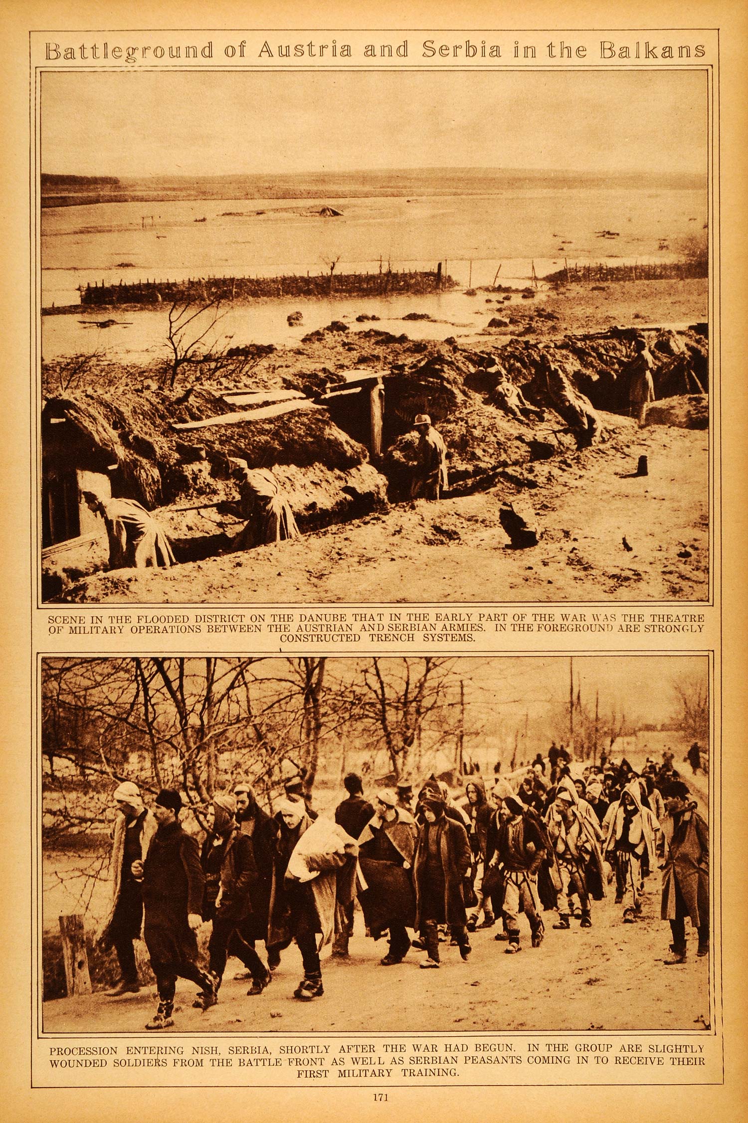 This is an original 1922 sepia rotogravure of a trench system near the flooded Danube river, and soldiers entering Nish, Serbia during World War I. The caption for the bottom image writes, "Procession entering Nish, Serbia, shortly after the war had begun. In the group are slightly wounded soldiers from the battle front as well as Serbian peasants coming in to receive their first military training."