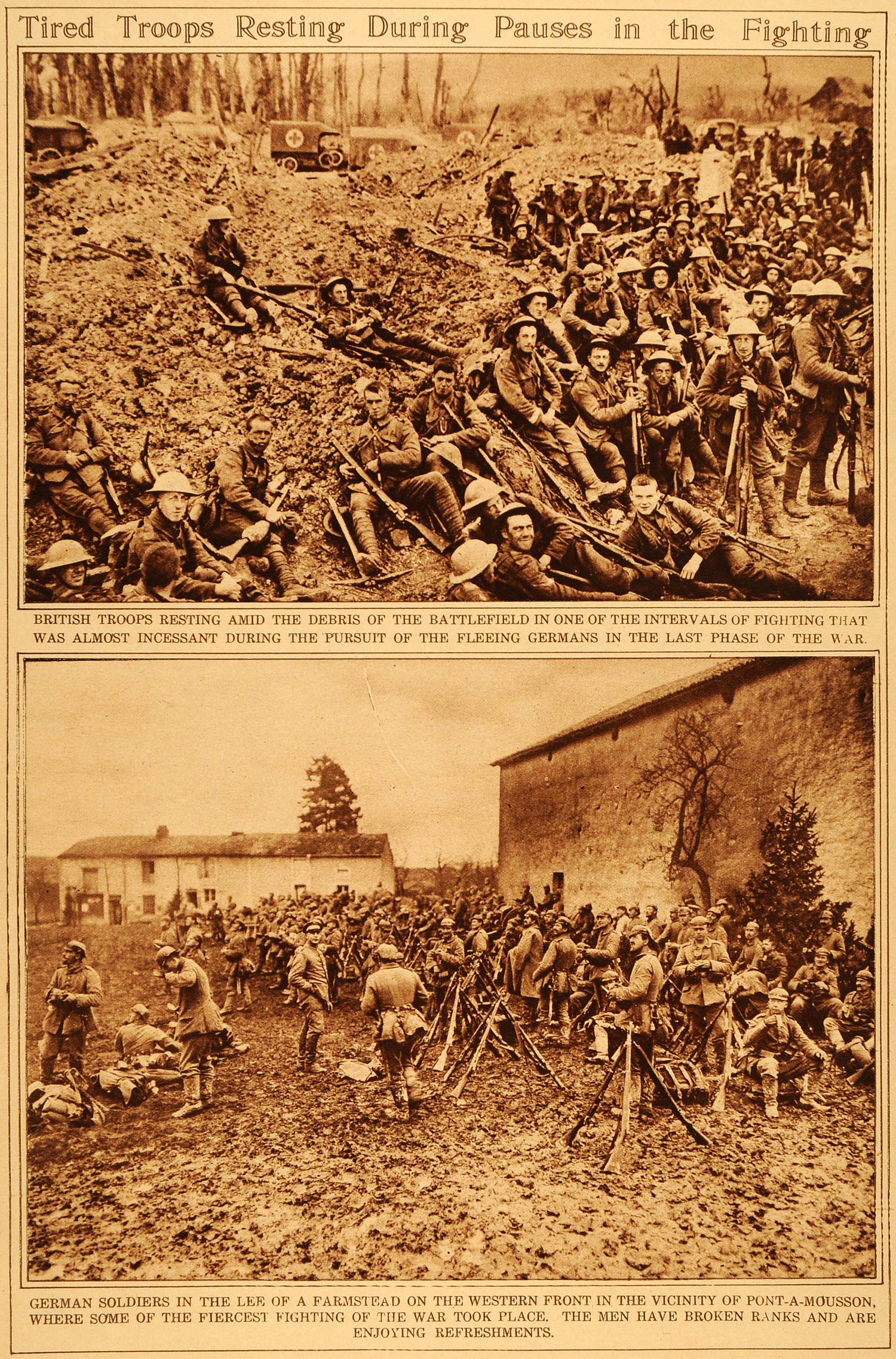 This is an original 1922 sepia rotogravure of British troops resting in a battlefield during World War I. The bottom image shows German soldiers at a farmstead around Pont-a-Mousson. The caption writes, "German soldiers in the lee of a farmstead on the western front in the vicinity of Pont-a-Mousson, where some of the fiercest fighting of the war took place. The men have broken ranks and are enjoying refreshments."