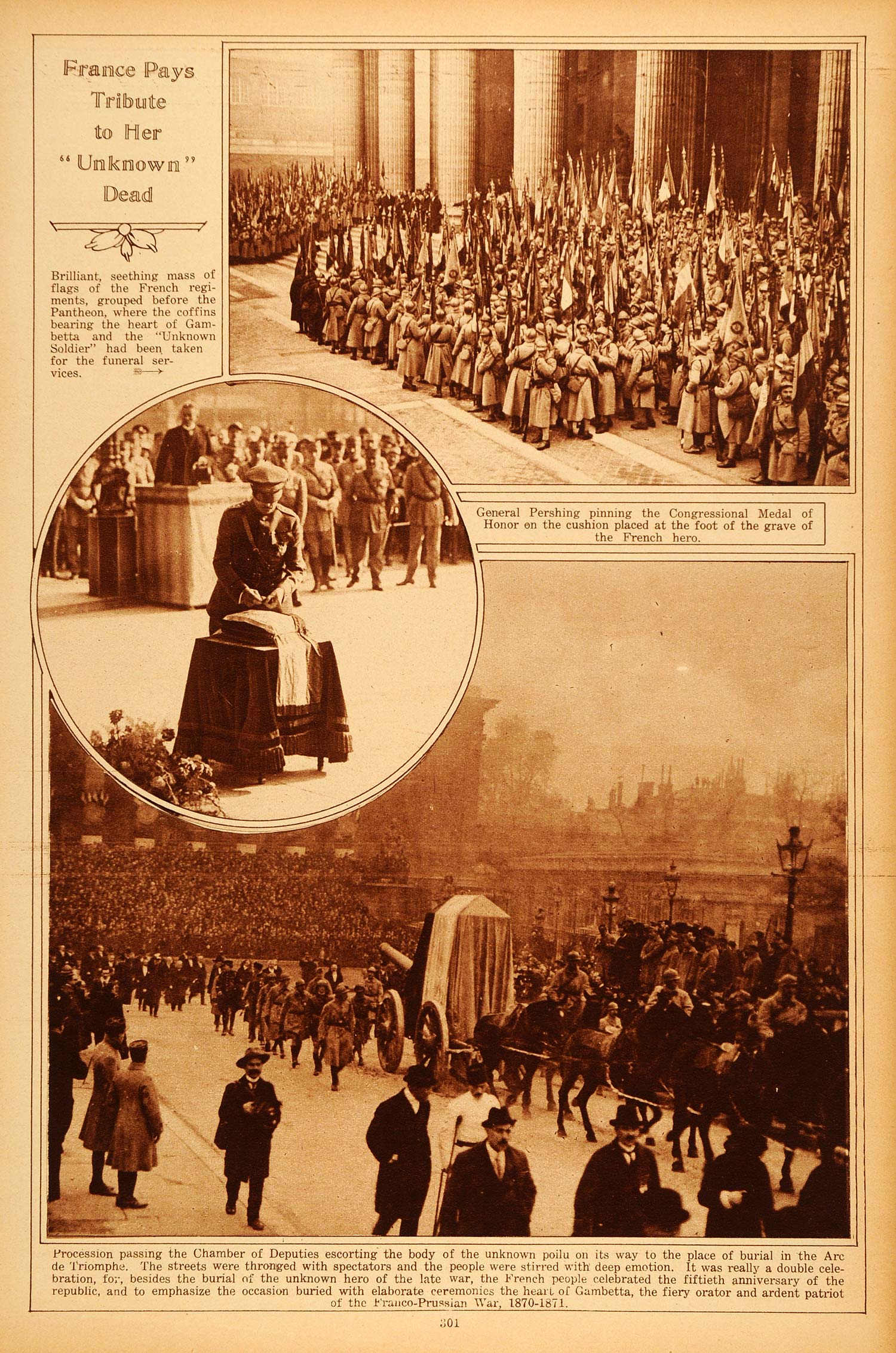 This is an original 1922 sepia rotogravure of France's tribute to her unknown soldier. Shown is a mass of flags, General Pershing pinning the Congressional Medal of Honor at the foot of the French hero's grave, and the procession to the Arc de Triomphe in Paris, France (Republique Fran&3231;aise). The caption for the bottom image writes, "Procession passing the Chamber of Deputies escorting the body of the unknown poilu on its way to the place of burial in the Arc de Triomphe. The streets were thronged with spectators and the people were stirred with deep emotion. It was really a double celebration, for, besides the burial of the unknown hero of the late war, the French people celebrated the fiftieth anniversary of the republic, and to emphasize the occasion buried with elaborate ceremonies the heart of Gambetta, the fiery orator and ardent patriot of the Franco-Prussian War, 1870-1871."