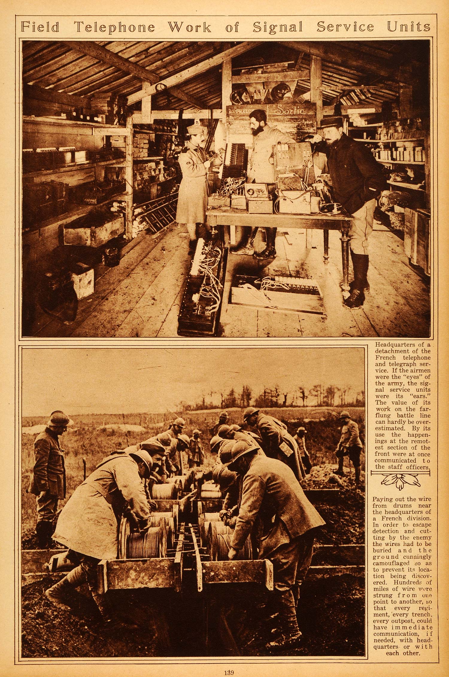 This is an original 1922 sepia rotogravure of French telephone and telegraph service units during World War I. Shown in the bottom image are troops pulling out the wire. The caption writes, "Paying out the wire from drums near the headquarters of a French division. In order to escape detection and cutting by the enemy the wires had to be buried and the ground cunningly camouflaged so as to prevent its location being discovered. Hundreds of miles of wire were strung from one point to another, so that every regiment, every trench, every outpost, could have immediate communication, if needed, with headquarters or with each other."