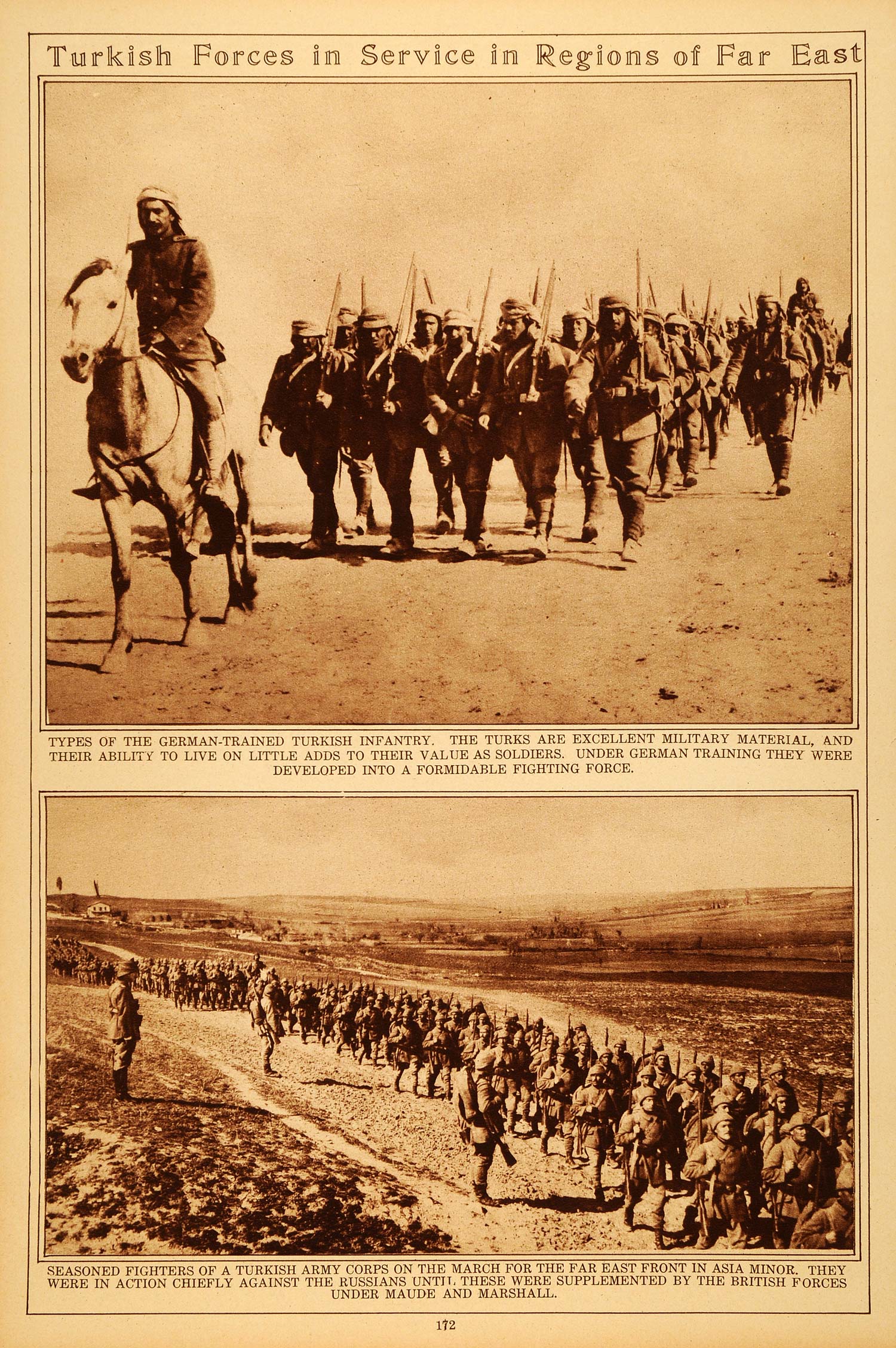 This is an original 1922 sepia rotogravure of Turkish soldiers during World War I. In the top image, the troop is seen on the march. The caption writes, "Types of the German-trained Turkish infantry. The Turks are excellent military material, and their ability to live on little adds to their value as soldiers. Under German training they were developed into a formidable fighting force." The bottom image shows the fighters of a Turkish Army Corps moving to the Far East front.