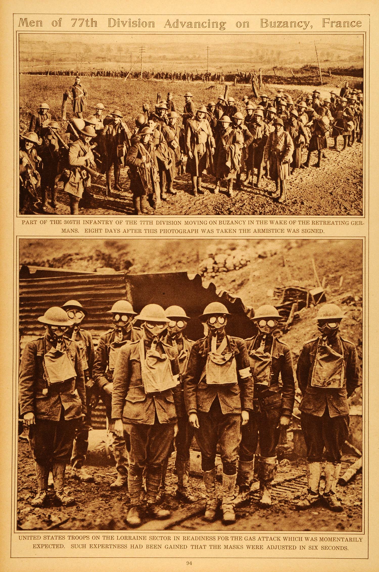 This is an original 1922 sepia rotogravure of the men from the 77th division moving in Buzancy, France (Republique Française). The bottom image shows the American Expeditionary Forces with their gas masks on in the Lorraine sector. The caption for the top image writes, "Part of the 305th Infantry of the 77th Division moving on Buzancy in the wake of the retreating Germans. Eight days after this photograph was taken the armistice was signed."