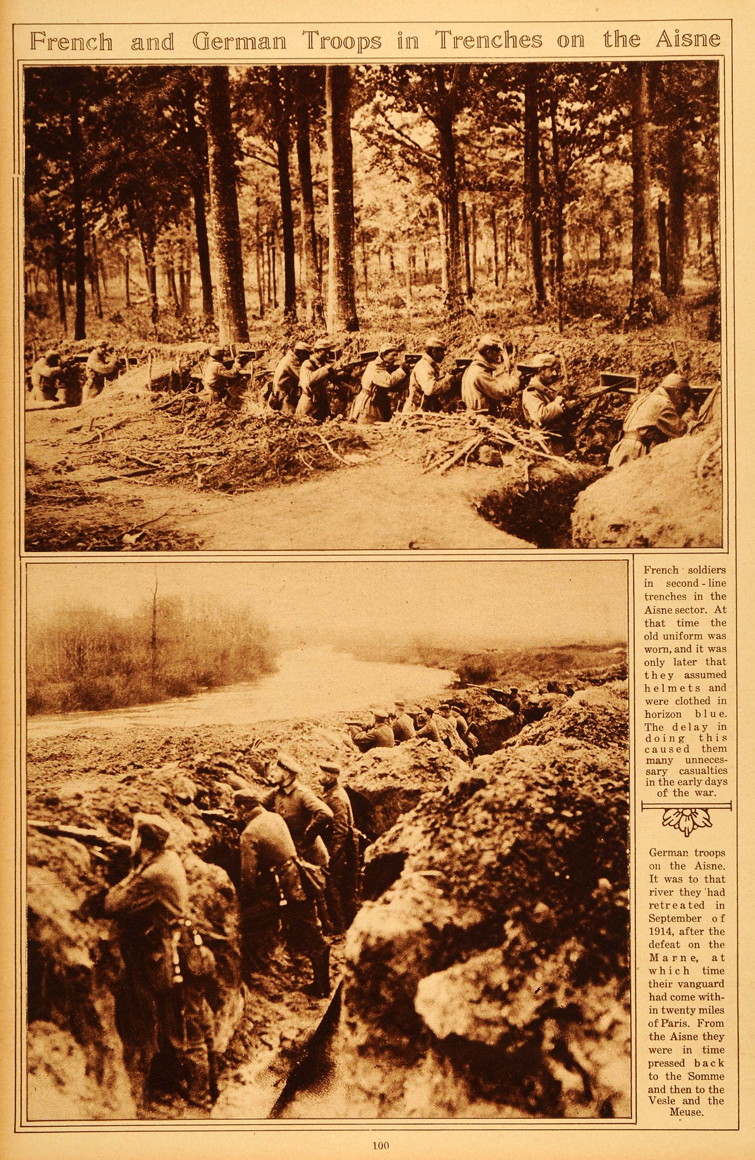 This is an original 1922 sepia rotogravure of French soldiers in the trenches of the Aisne sector. The bottom image depicts the German troops on the Aisne. The caption writes, "It was to that river they had retreated in September of 1914, after the defeat on the Marne, at which time their vanguard had come within twenty miles of Paris. From the Aisne they were in time pressed back to the Somme and then to the Vesle and the Meuse."