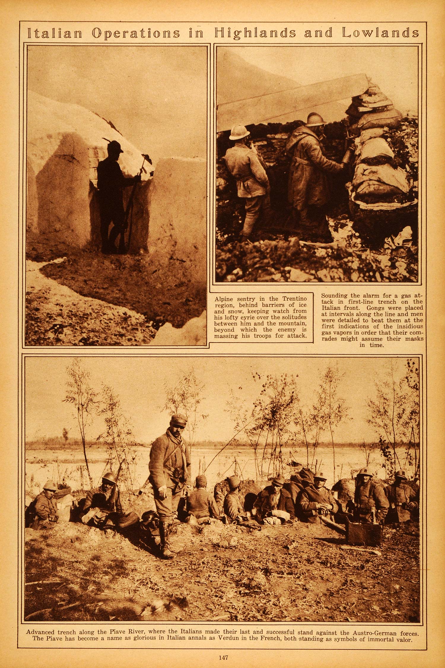 This is an original 1922 sepia rotogravure of an Alpine sentry in the Trentino region, men sounding gas attack alarms on the Italian front, and a trench along the Piave River. The caption for the gas alarm image writes, "Sounding the alarm for a gas attack in first-line trench on the Italian front. Gongs were placed at intervals along the line and men were detailed to beat them at the first indications of the insidious gas vapors in order that their comrades might assume their masks in time."