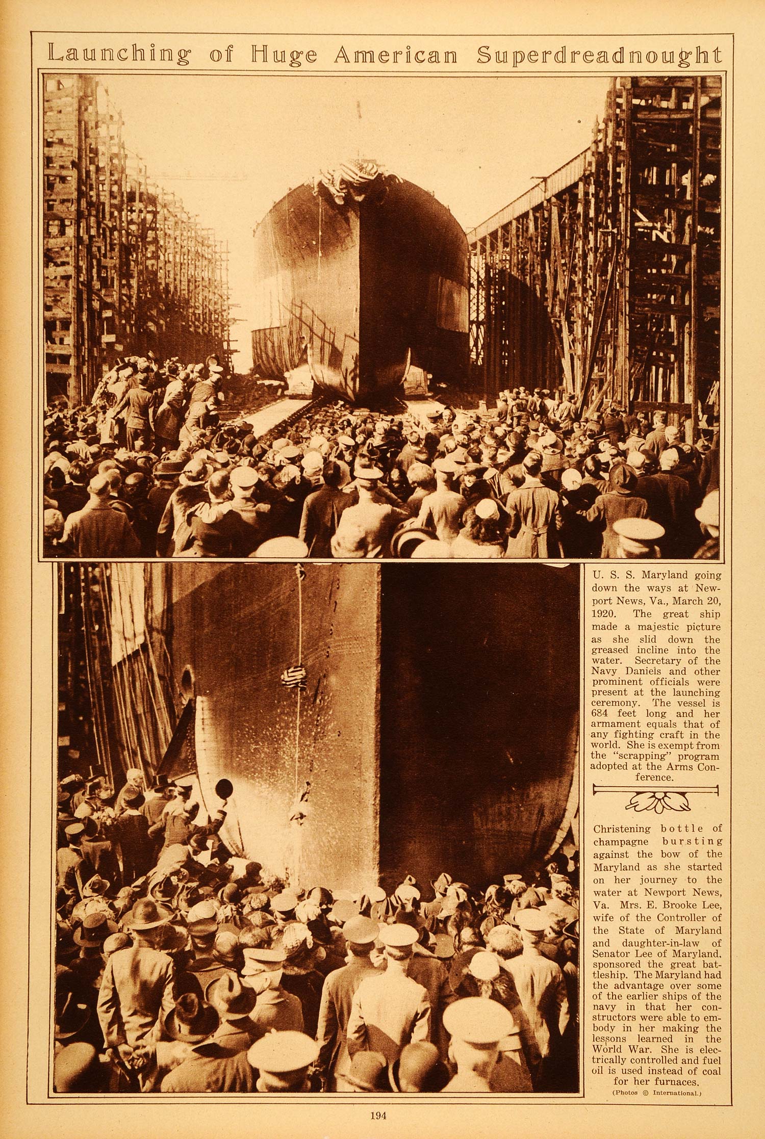 Maryland at Newport News, Virginia. Secretary of the Navy Daniels appeared for her launching ceremony. The bottom image shows the christening bottle of champagne exploding against the superdreadnaught.