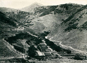This is an original 1922 duotone tipped-in halftone print of an irrigation valley in the Atlas Mountains of Morocco.