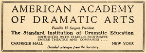 This is a tiny original 1923 black and white print ad for the American Academy of Dramatic Arts. The ad writes, "Connected with Charles Frohman's Empire Theatre and Companies..."