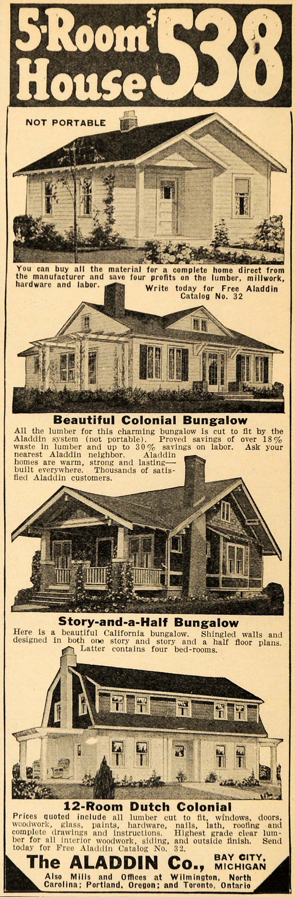 This is an original 1923 black and white print ad for 5-Room Houses for $538 by The Aladdin Company in Bay City, Michigan. Houses featured include a Colonial Bungalow, a story-and-a-half Bungalow and a 12-room Dutch Colonial house.