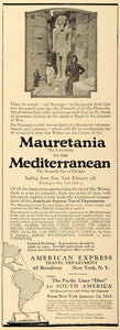 This is an original 1923 black and white print ad for the American Express Travel Department, featuring travel to the Mediterranean via the luxurious Mauretania.