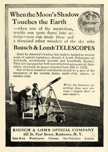 This is a small original 1923 black and white print ad for telescopes by the Bausch and Lomb Optical Company, located at 602 St. Paul Street in Rochester, New York.