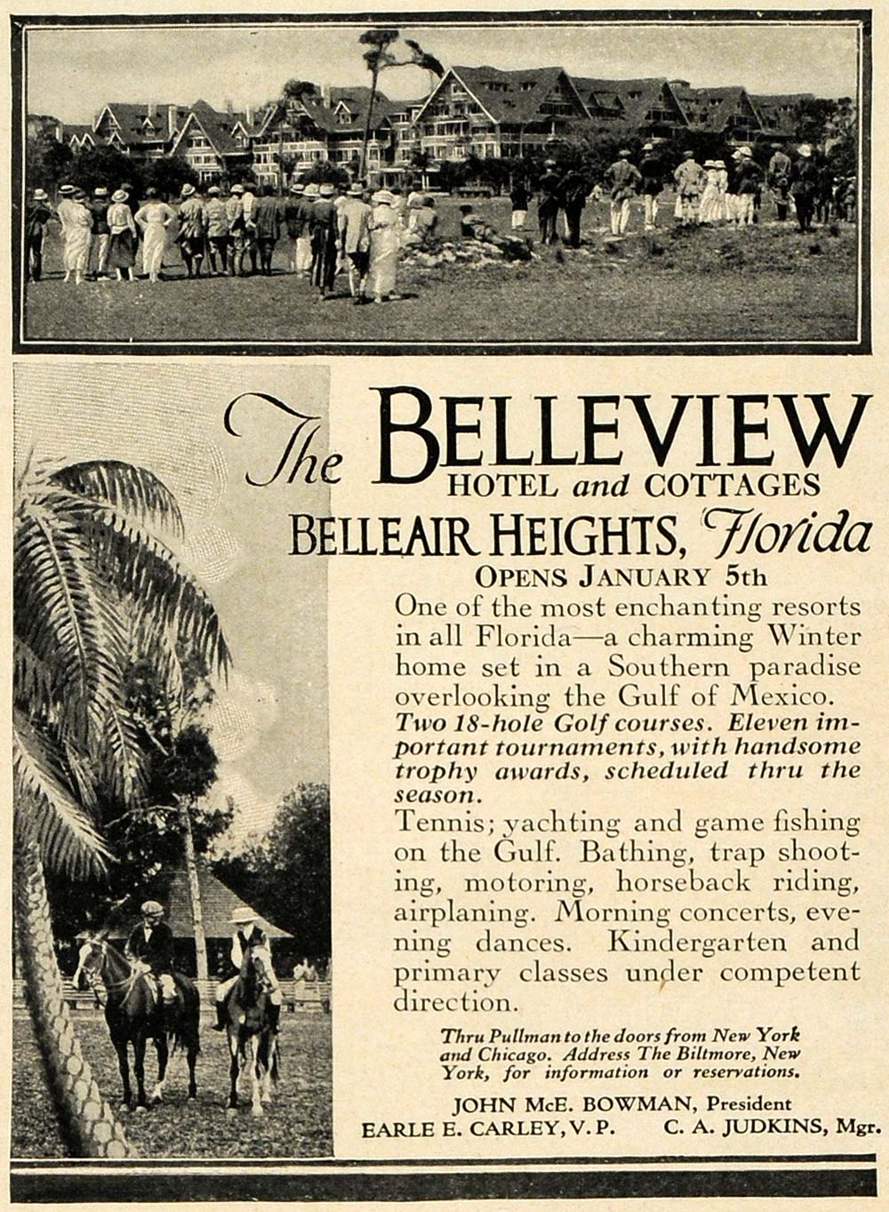 This is a rare original 1923 black and white print ad for the Belleview Hotel and Cottages of Belleair Heights, Florida. Their President is John McE. Bowman, and they offer 18-hole golf courses.