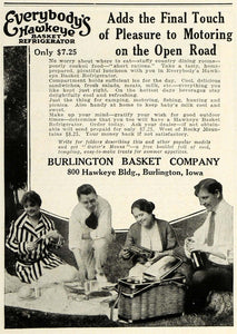 This is an original 1923 black and white print ad for the Burlington Basket Company of 800 Hawkeye Building in Burlington, Iowa. This ad features their Everybody's Hawkeye picnic Basket Refrigerator for keeping food cold in the outdoors.