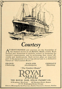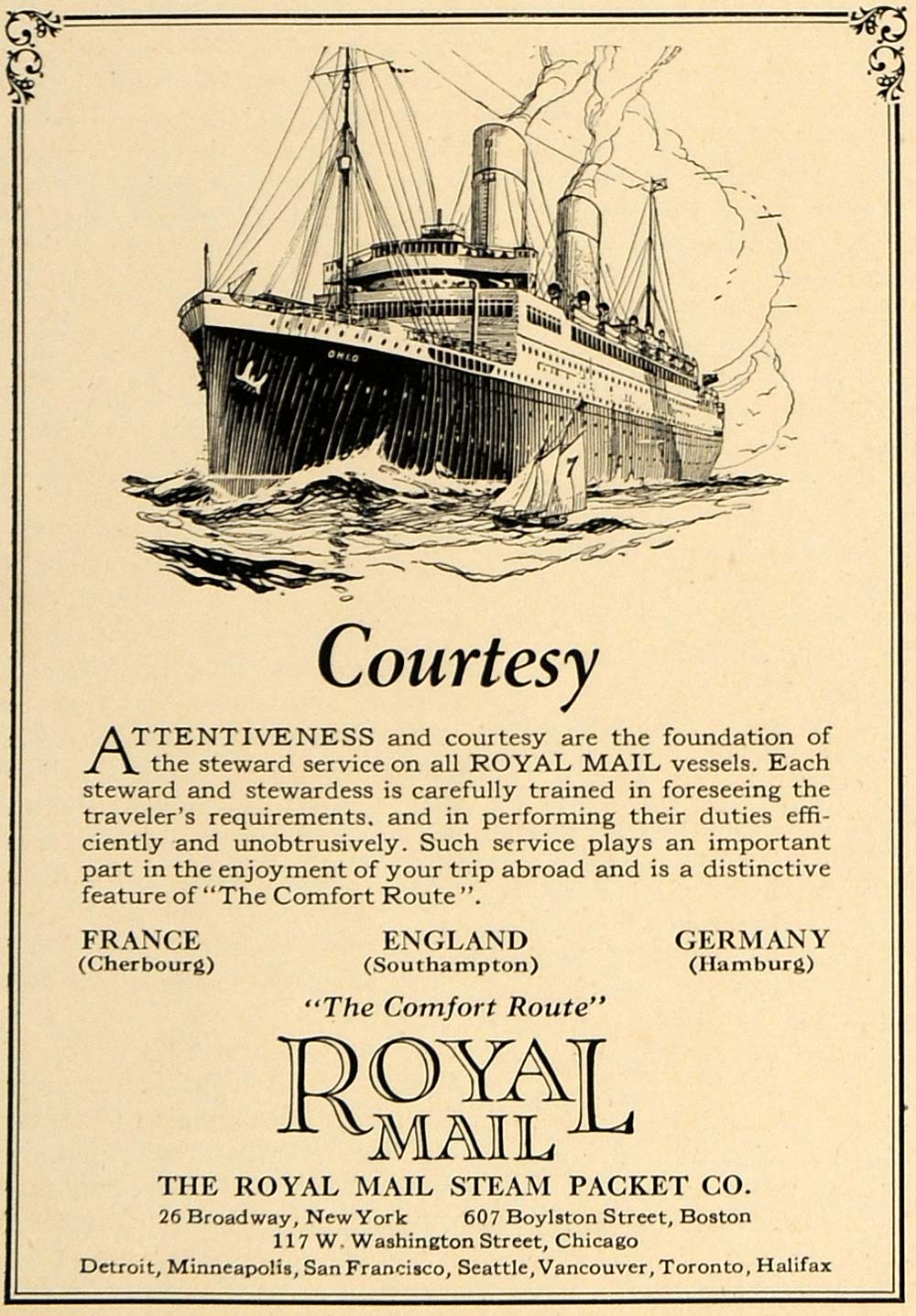 This is an original 1923 black and white print ad for "The Comfort Route" to Cherbourg France, Southampton England and Hamburg Germany by The Royal Mail Steam Packet Company. They are located at 26 Broadway, New York; 607 Boylston Street, Boston; 117 West Washington Street, Chicago.