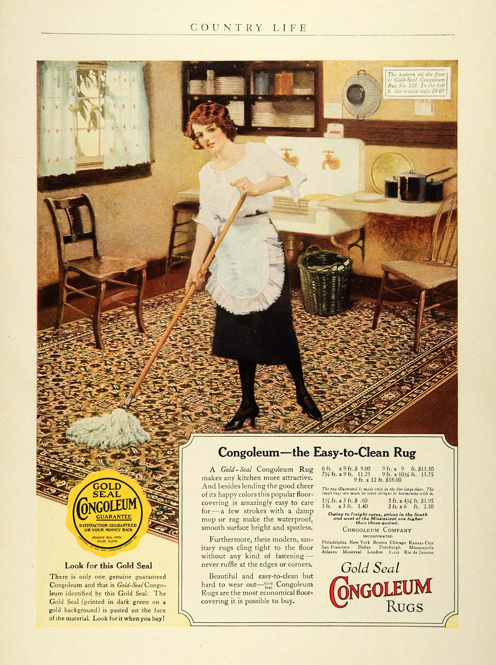 This is an original 1923 color print ad for the easy to clean Conguleum Gold Seal Rugs. The rug pattern featured in this ad is the Gold Seal Congoleum Rug No. 528.