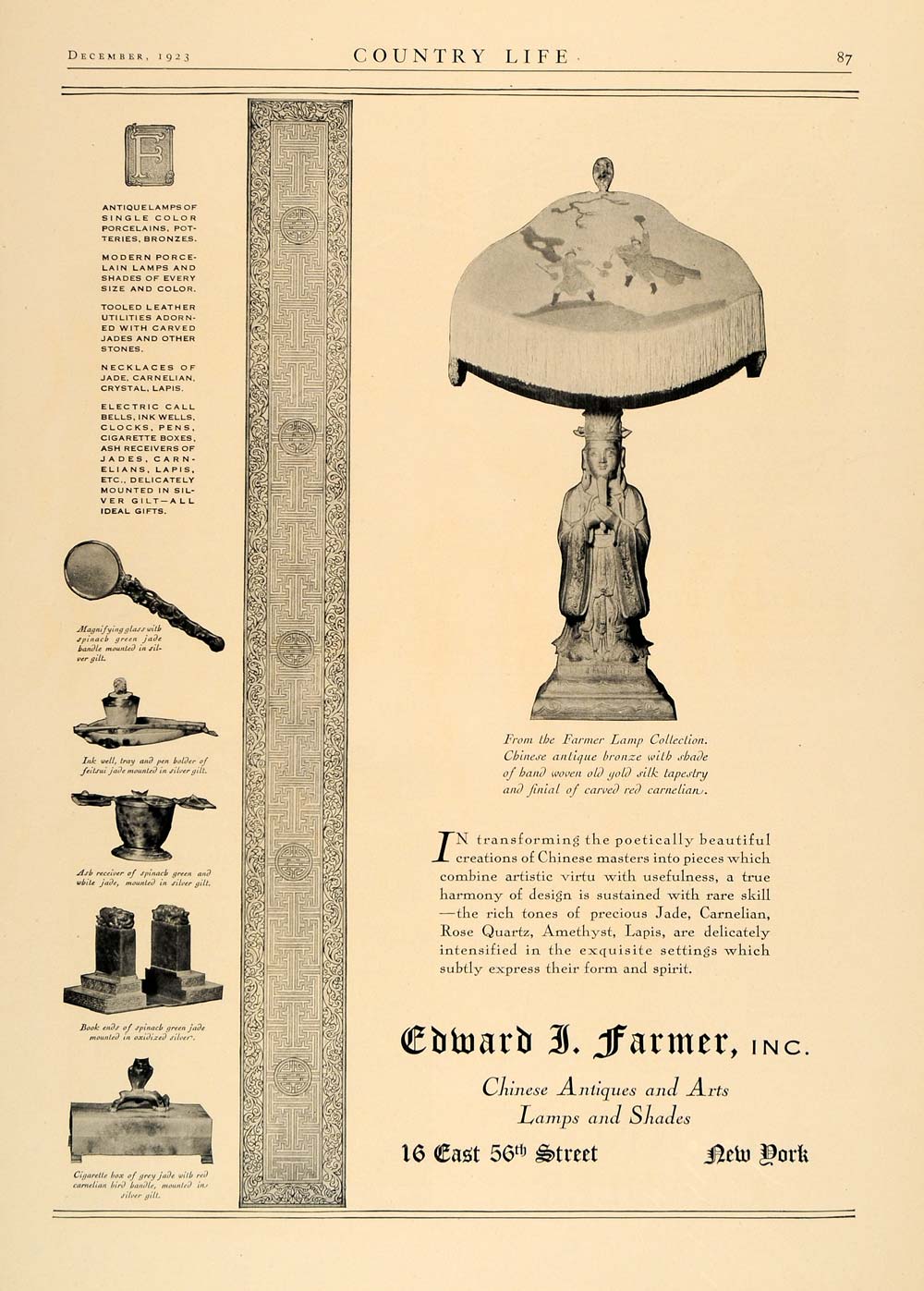 This is an original 1923 black and white print ad for Edward J. Farmer, Incorporated, specialists in Chinese Antiques, Arts, Lamps, and Shades. They are located at 16 East 56th Street in New York.