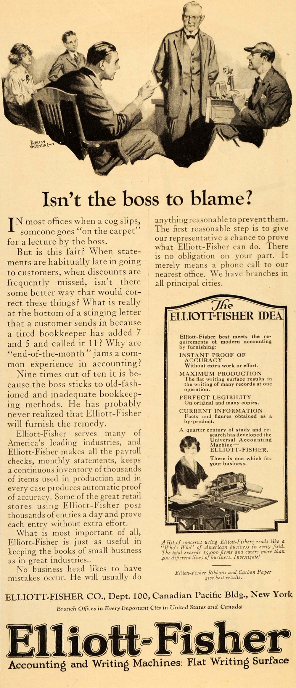 This is an original 1923 black and white print ad for Elliott-Fisher business accounting and writing machines.