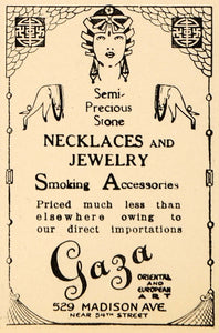 This is a small original 1923 black and white print ad for Gaza semi-precious stone necklace and jewelry. The ad writes, "Priced much less than elsewhere owing to our direct importations."