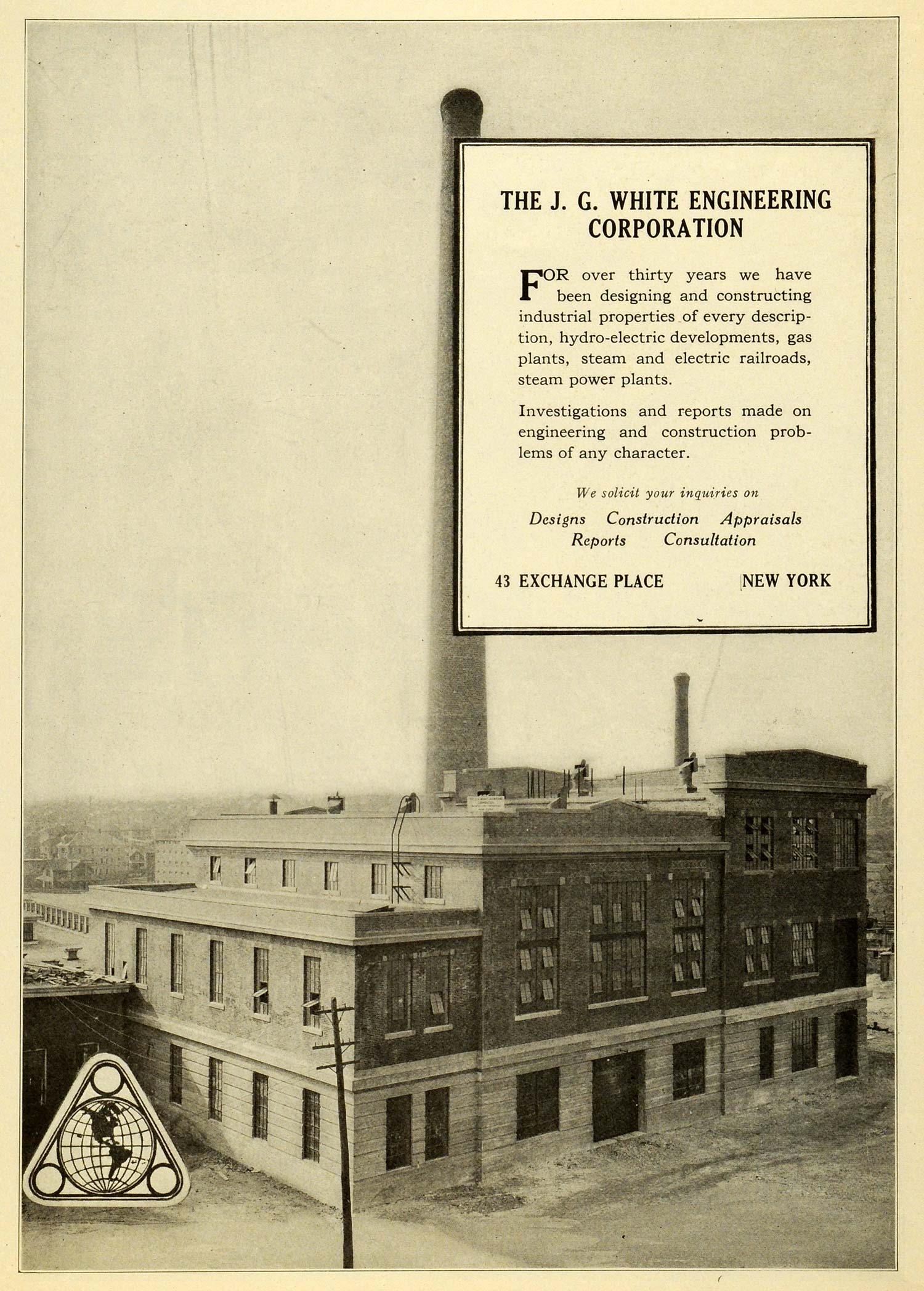 This is an original 1923 black and white print ad for the J. G. White Engineering Corporation promoting designs, construction, appraisals, reports and consultation located at 43 Exchange Place, New York.