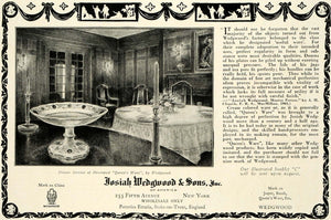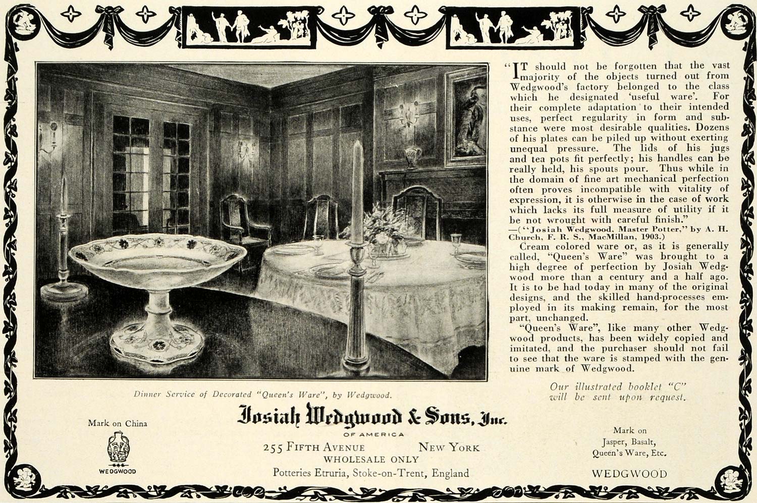 This is an original 1923 black and white print ad for Josiah Wedgwood & Sons, Incorporated, of 255 Fifth Avenue in New York. This ad features their pottery, china, and other fine dinnerware.