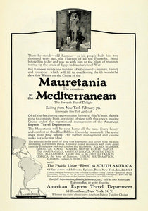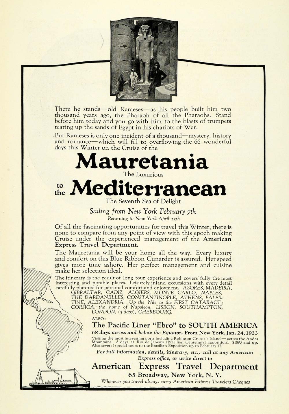 Mauretania from the American Express Travel Department of 65 Broadway, New York. Shown in the illustration is a statue of the Egyptian pharaoh, Rameses.