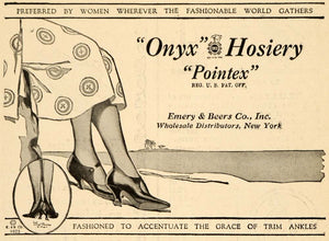 This is an original 1923 black and white print ad for Onyx Hosiery from the Emery and Beers Company. The ad writes, "Fashioned to accentuate the grace of trim ankles."