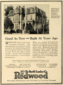 This is an original 1923 black and white print ad for the Pacific Lumber Company of Chicago, New York, San Francisco, and Los Angeles. This ad features their Redwood lumber for home building and improvement.