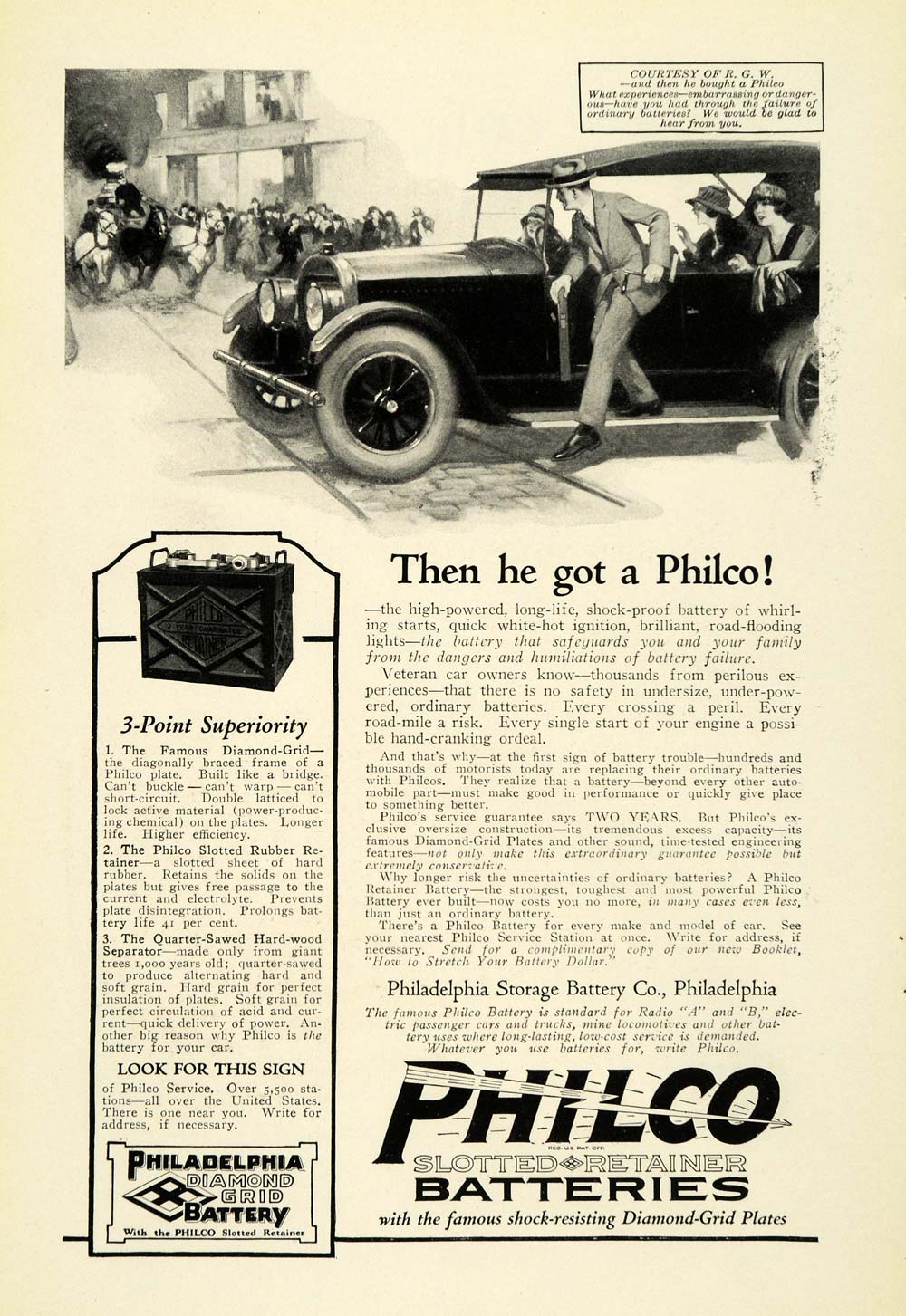 This is an original 1923 black and white print ad for Philco Slotted Retainer Batteries for cars, a product by the Philadelphia Storage Battery Company.