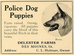 This is an original 1923 black and white print ad for Police Dog Puppies by Delester Farms, owned by C. L. Hulsizer and located in Des Moines, Iowa.