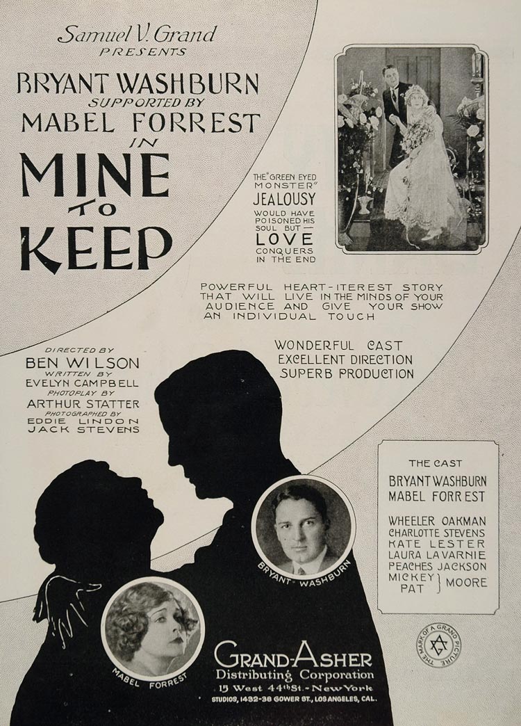 This is an original 1923 black and white ad for the silent film "Mine to Keep." It was directed by Ben Wilson, written by Evelyn Campbell, photoplay by Arthur Statter, and photographed by Eddie Lindon and Jack Stevens. It starred Bryant Washburn, Mabel Forrest, Wheeler Oakman, Charlotte Stevens, Kate Lester, Laura La Varnie, Peaches Jackson, and Mickey and Pat Moore. Distributed by the Grand-Asher Distributing Corporation. This is an excellent historical print item for the silent film collector!
