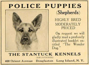 This is an original 1923 black and white print ad for Police Puppies (Shepherds) by The Stantuck Kennels located at 400 Orient Avenue, Douglaston, Long Island, New York.