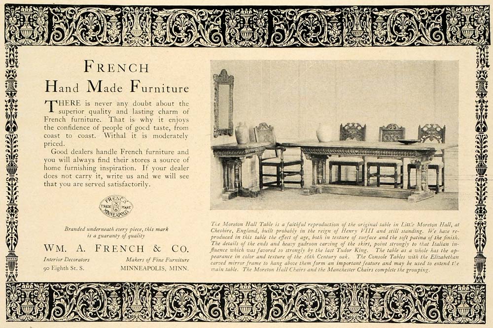 This is an original 1923 black and white print ad for Wm. A. French & Company of 90 Eighth St. South in Minneapolis, Minnesota. This ad features their French Hand Made furniture for home decorating purposes.