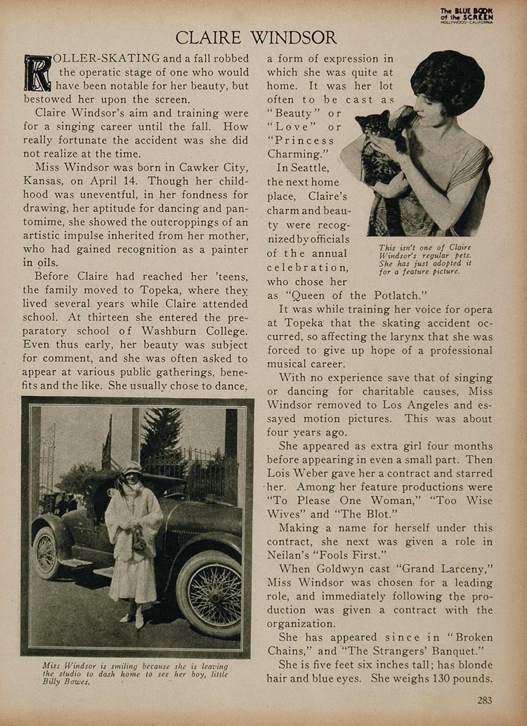 This is an original 1923 two-page halftone print of Claire Windsor (1892-1972), an American silent film actress whose films include: "To Please One Woman," "Too Wise Wives," "The Blot," "Grand Larceny," "Broken Chains," "The Strangers' Banquet," and "Fools First." Please see both images. (Please note that there is printing on the reverse of each.)