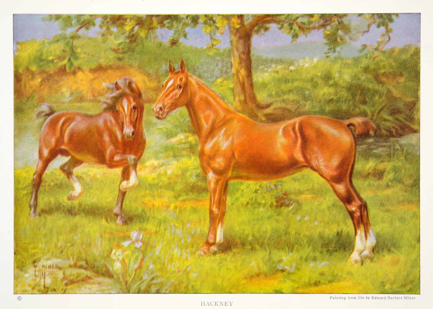 This is an original 1923 color print of a couple Hackey Horses. Originally bred in Great Britain for rudimentary road use, Hackeys are capable of fast and high stepping trotting, which they can sustain for long periods of time.