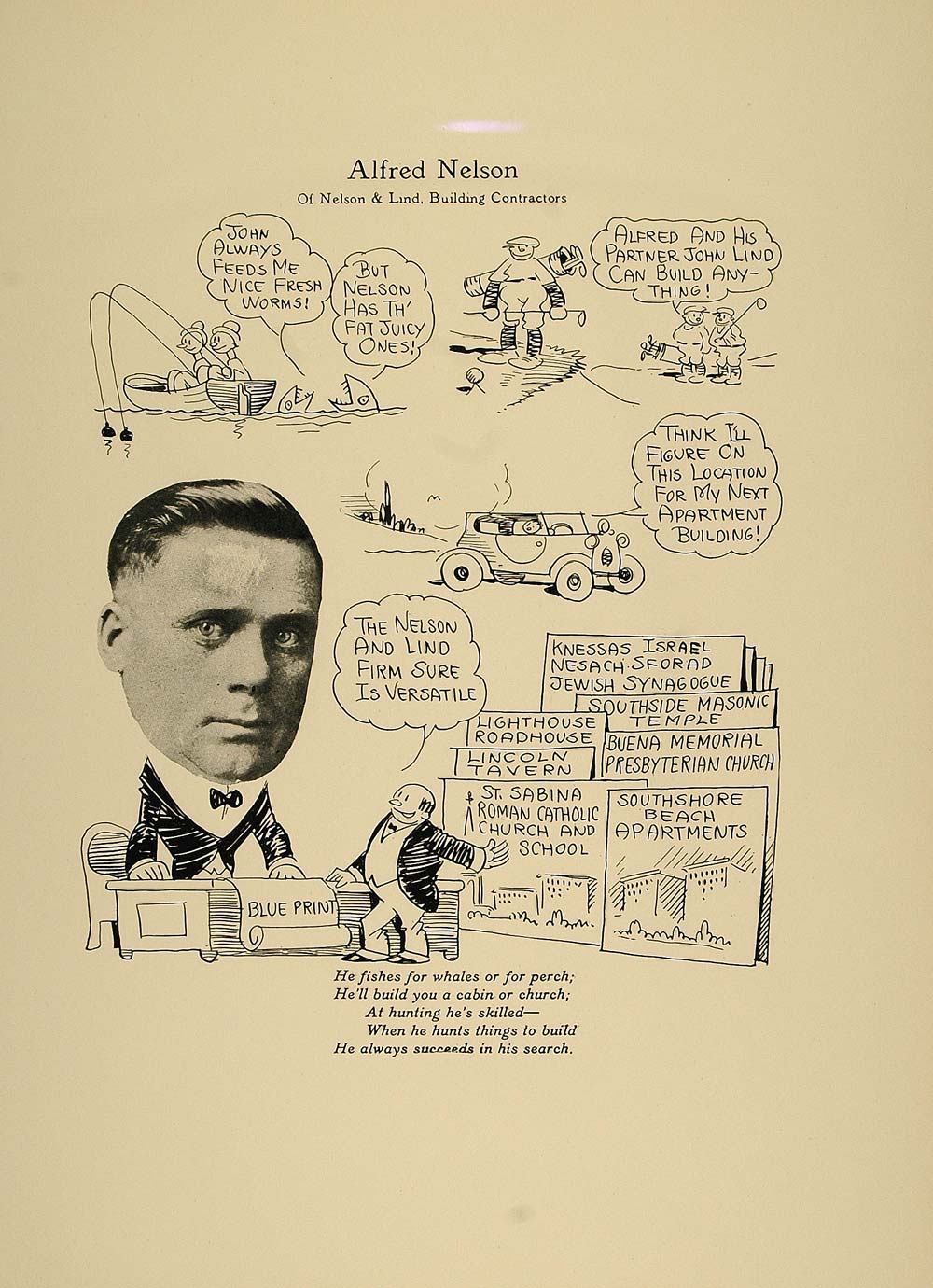 This is an original 1923 black and white print of Alfred Nelson whose company built the Knessas Israel Nesach Sforad Jewish Synagogue, the Souhside Masonic Temple, the Lighthouse Roadhouse, the Lincoln Tavern, the Southshore Beach Apartments, the Buena Memorial Presbyterian Church, and the St. Sabina Roman Catholic Church and School.