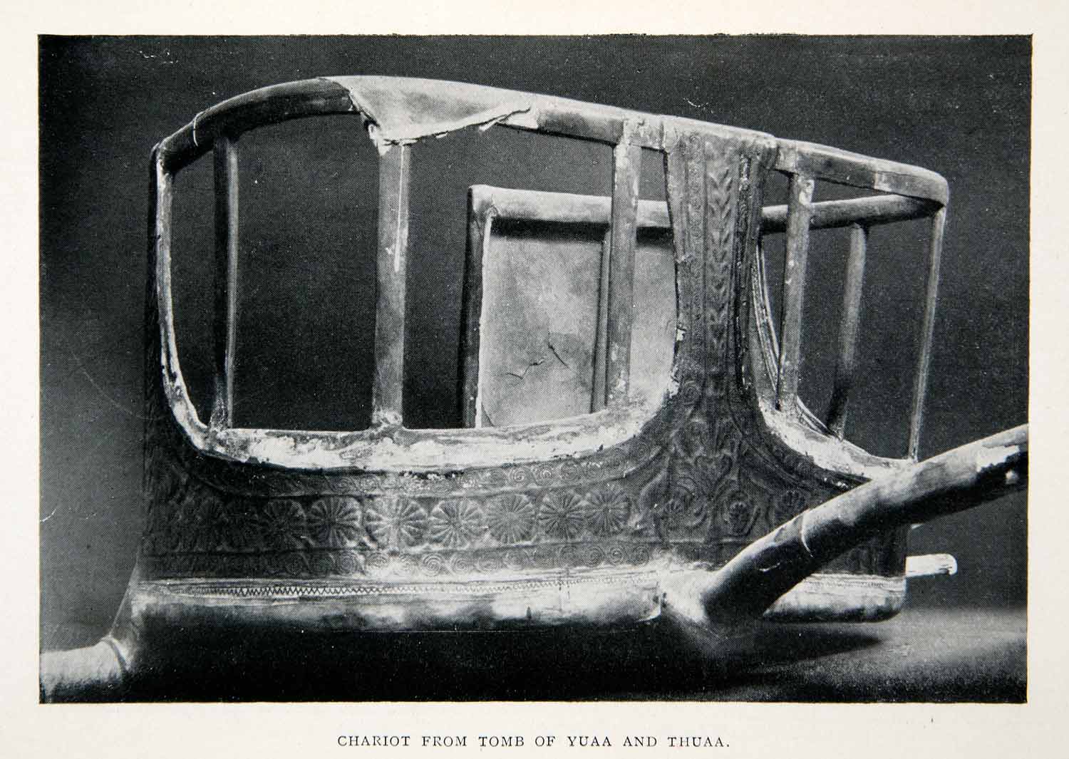 This is an original 1923 black and white halftone print of a chariot from the tomb of Yuya and Tjuyu, who were noble people, and were buried in the Valley of the Kings.