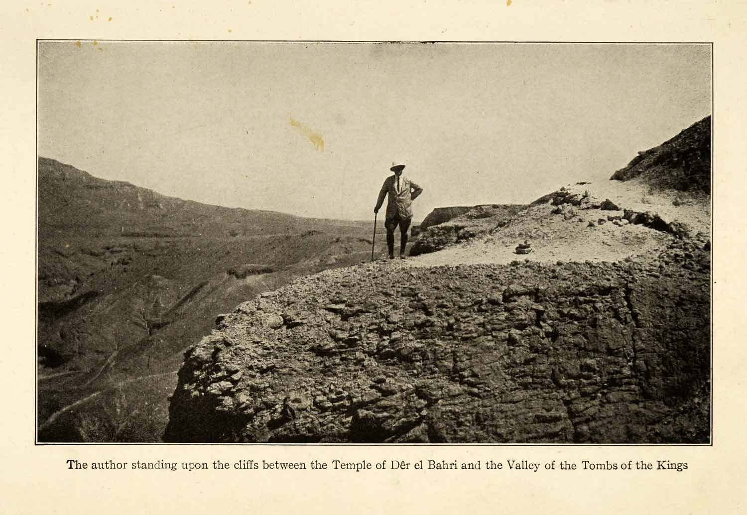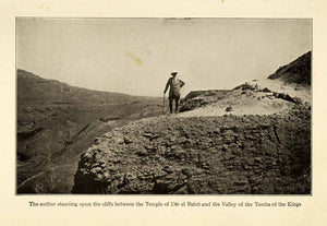 This is an original 1923 halftone print of author Arthur Weigall standing on the cliffs between the mortuary temple of Del el Bahri and the Valley of the Kings, on the west bank of the Nile.