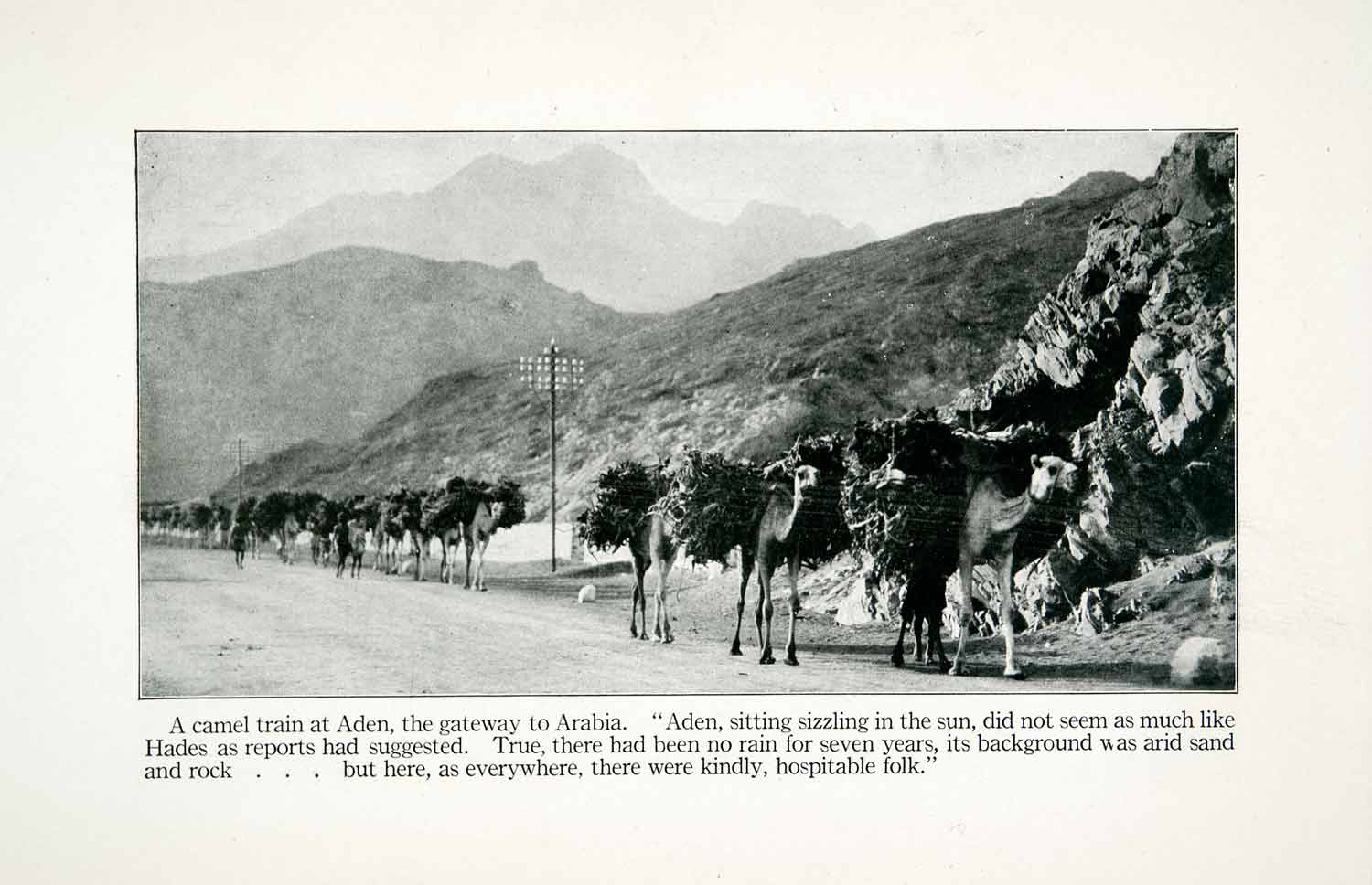 This is an original 1923 black and white halftone print of a camel train in Aden, Yemen.